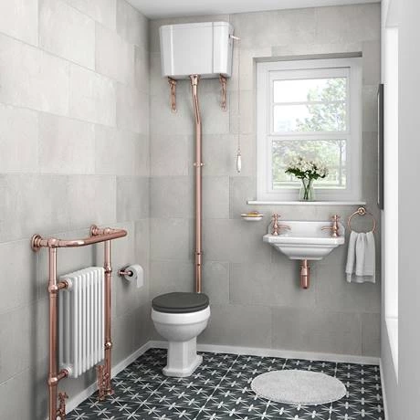 A rose gold plated traditional Victorian style high level WC flush pipe set, perfect for providing a period look in any home, includes a high level flush pipe, fulcrum lever, chain pull and ornate cistern support brackets.