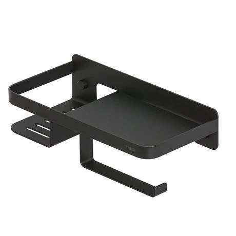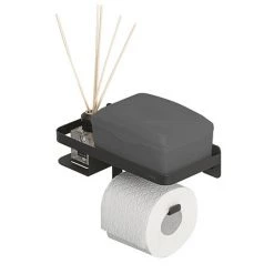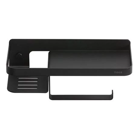 The unique Tiger Caddy Toilet Roll Holder with Shelf. This all-in-one toilet solution offers space for fragrance sticks, your mobile phone, wipes or even a storage box sanitary products. Bring the modern look to your bathroom with this variant in Black.